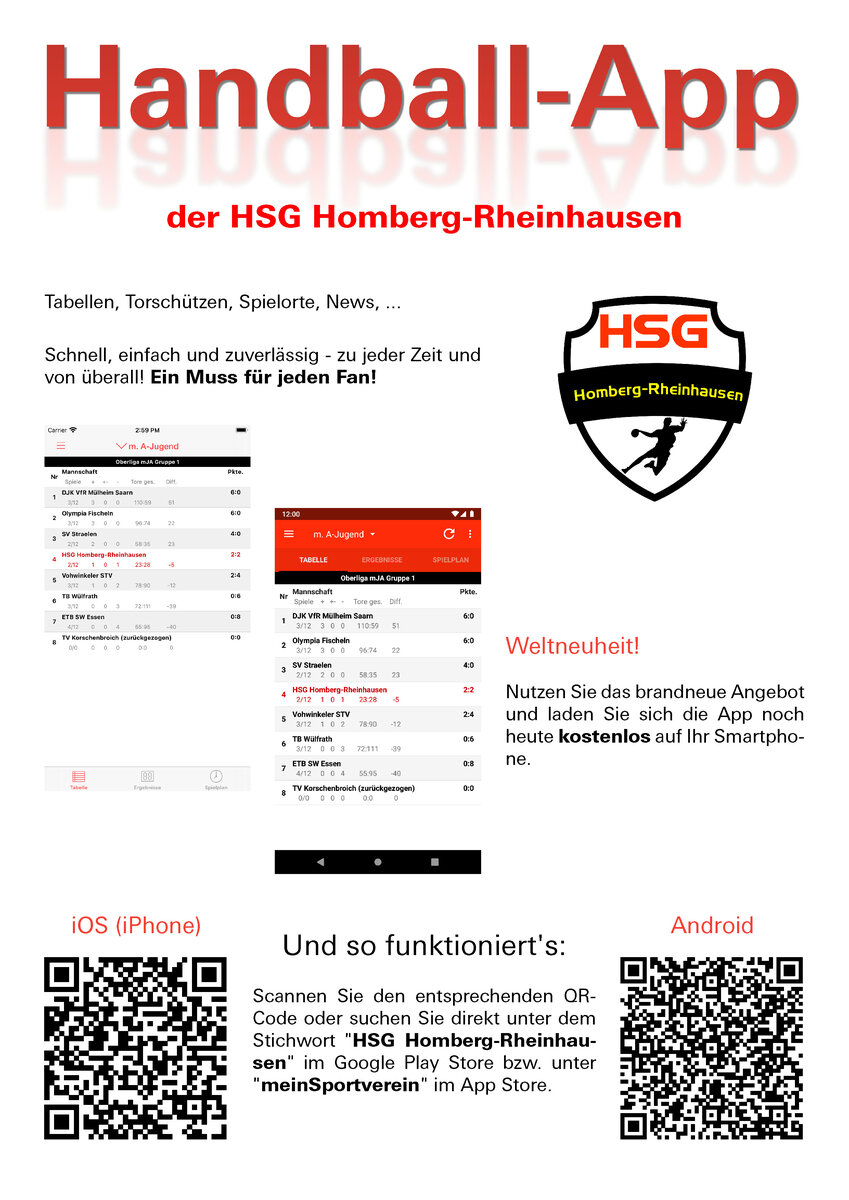 Sie können sie ab sofort auf Ihrem Android-Handy oder iPhone nutzen – selbstverständlich kostenlos. Klicken Sie dazu einen der unten stehenden Links an oder suchen Sie direkt unter dem Stichwort „HSG Homberg-Rheinhausen“ im Google Play Store bzw. „meinSportverein“ im App Store.